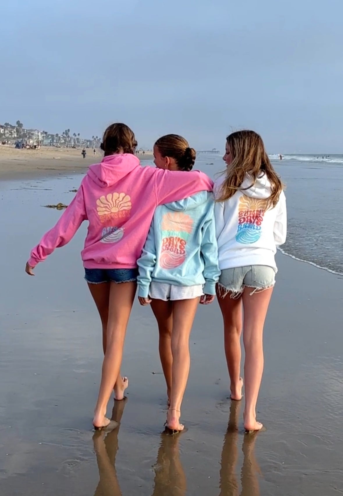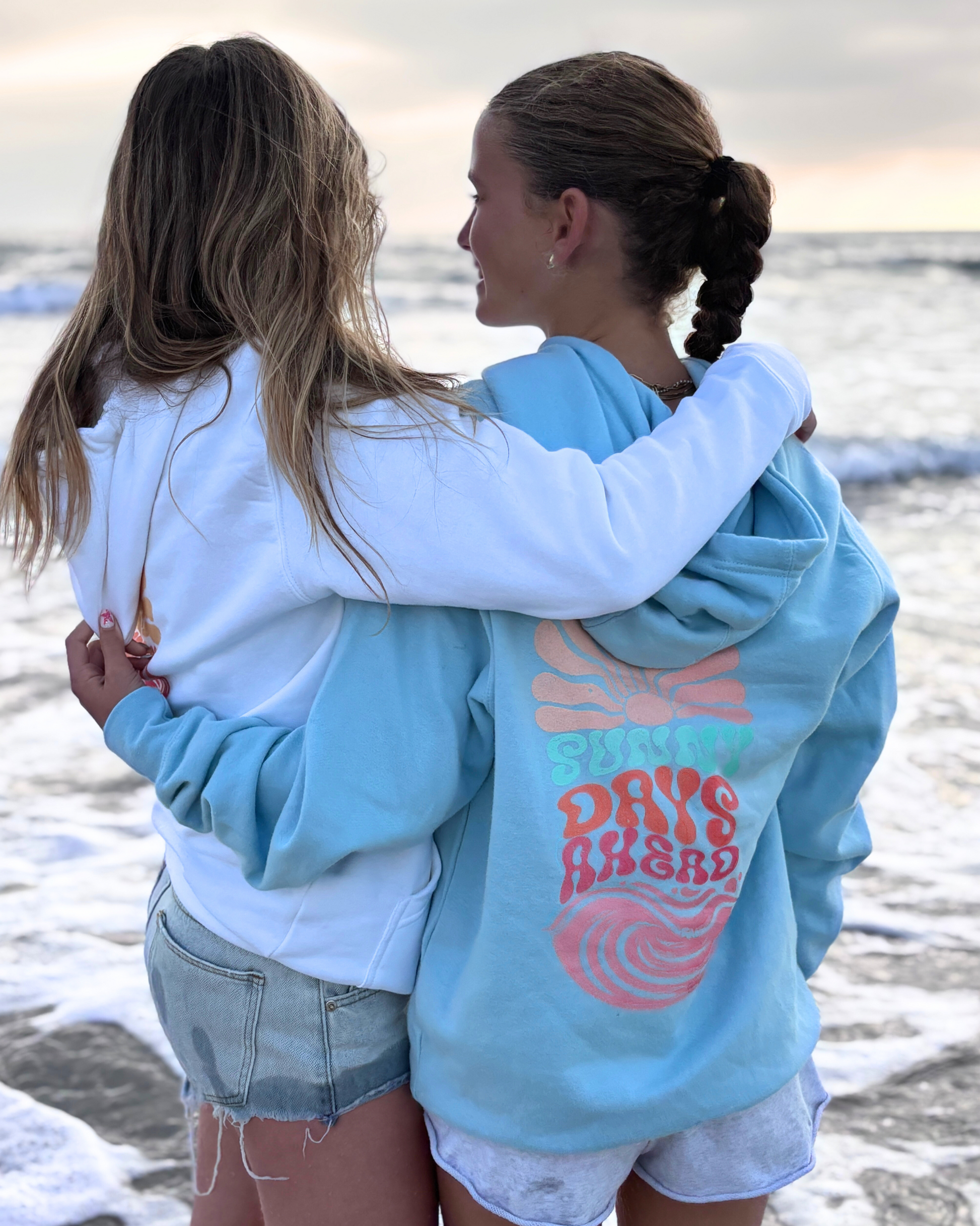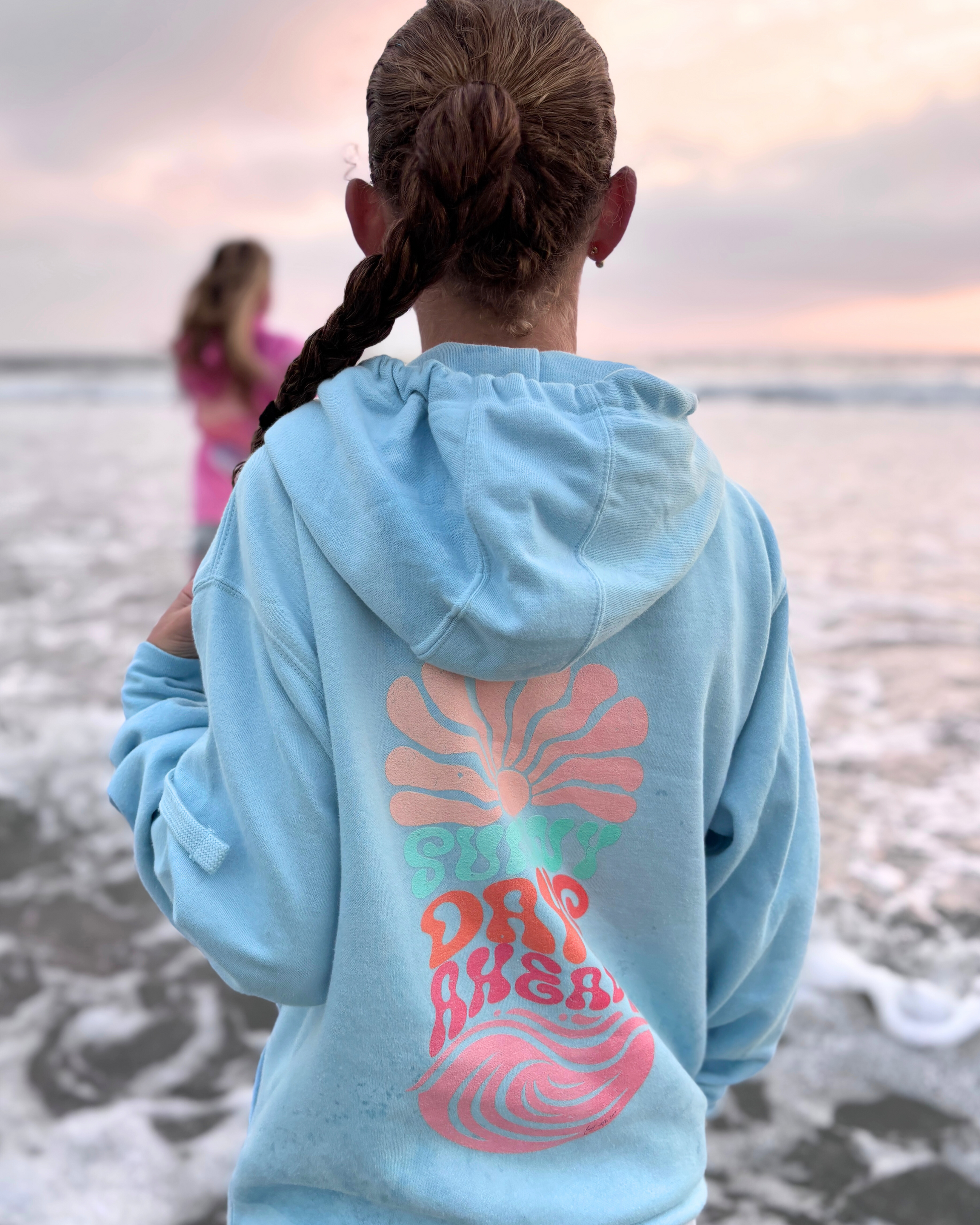 Sunny Days Collective™ Ahead features fun, retro lettering, radiant sun rays, and flowing waves, this design brings playful energy and comfort to your everyday style. This classic streetwear hoodie with a convenient pouch pocket and warm hood for chilly evenings. Features the pastel sunset colors. Lean with love is written in small script on the back.