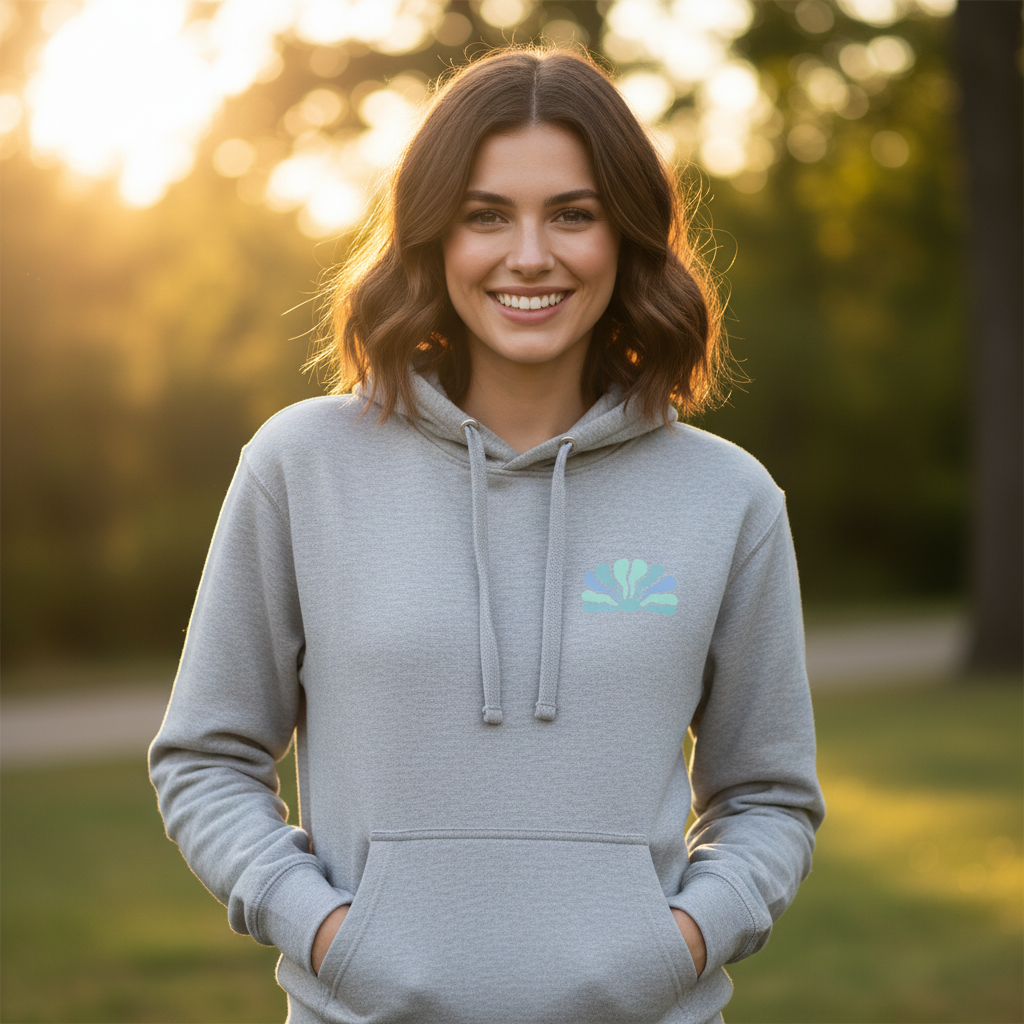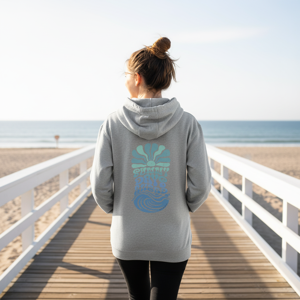 Sunny Days Ahead "LowTide" features blues inspired by the non-profit organization, The Teen Project*. A portion of proceeds from purchases of this hoodie will go to support The Teen Project. The "Low Tide" hoodie does feature a small graphic on the front. See images below. This hoodie features very small script on the back design that reads "It's darkest before the dawn.".